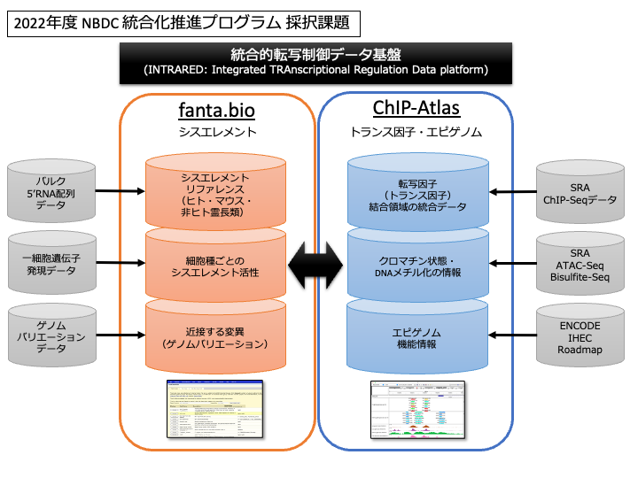 INTRARED は転写制御の総合的理解の推進を目的に、シスエレメント・トランス因子・エピゲノミクスデータを統合したデータ基盤です。本データ基盤は fanta.bio と ChIP-Atlas の2つのデータベースで構成され、fanta.bio は同一染色体上で遺伝子の発現の調節に関与するゲノム中の領域であるシスエレメントについて、その領域や細胞の種類・状態毎のシスエレメント領域の活性状態を同定して収録したデータベース、ChIP-Atlas はシスエレメントに結合するトランス因子や関連するエピゲノミクス情報を提供するデータベースです。本データ基盤では、両者のデータベースの開発・運営チームが相互協力し、転写制御に関係するデータセットとそれらを参照するインタフェースを提供します。